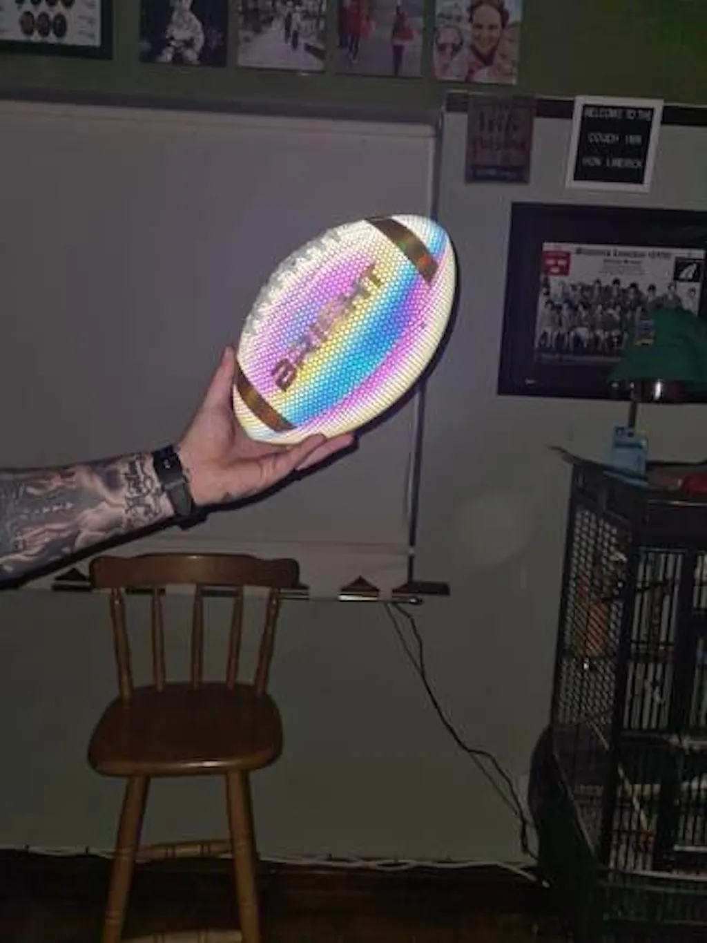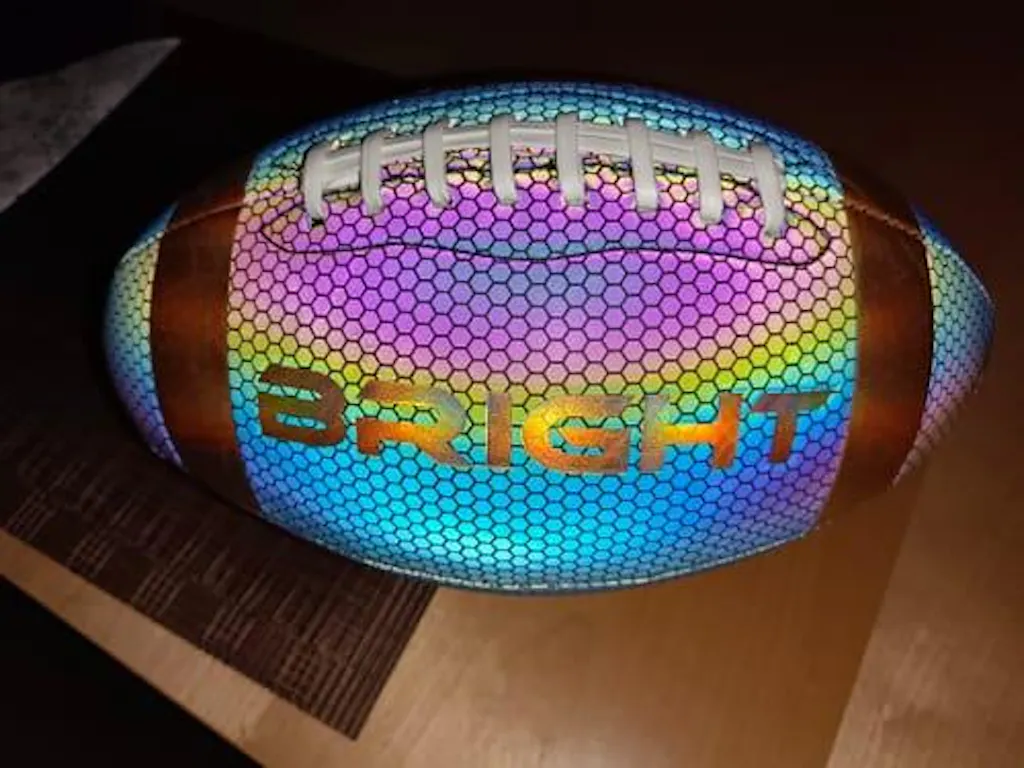The BRIGHT football is made of high-quality reflective leather with a holographic effect and has the feel and grip of a regular football. The ball appears black when it is completely dark and no light is shining on it, but when you take a photo/video with flash, the ball lights up on your phone screen.